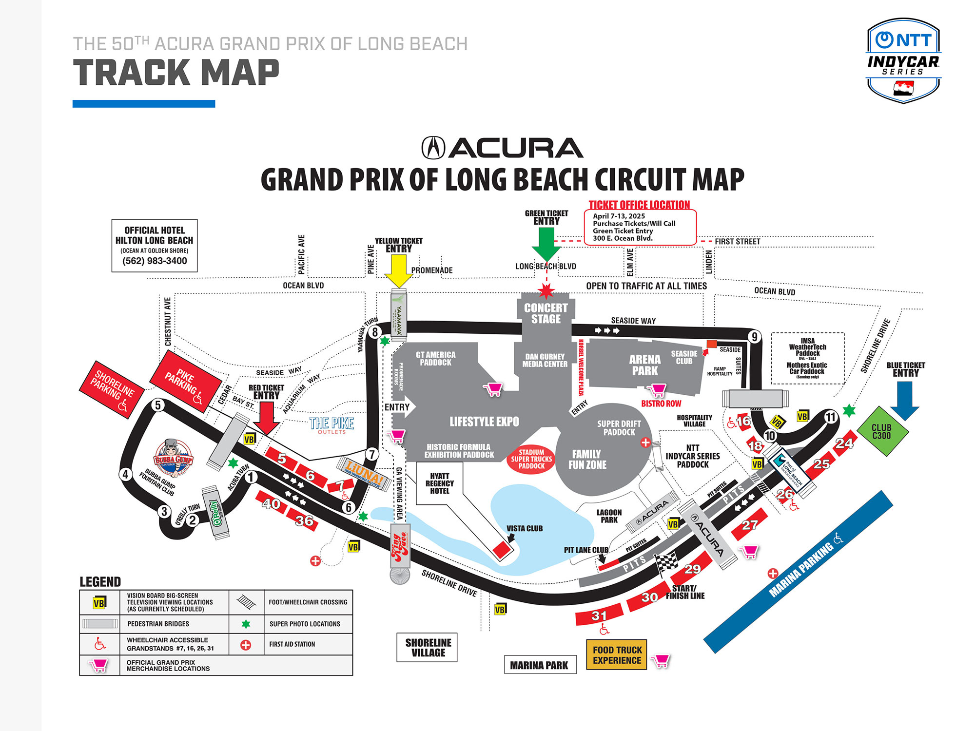 • The 1.968-mile, 11-turn temporary street circuit encircles the Long Beach Convention Center -- which houses a Family Fun Zone and numerous displays during the race weekend -- and runs down scenic Shoreline Drive. It offers numerous overtaking opportunities, including Turn 1, getting the hairpin turn just before the frontstretch right is critical.